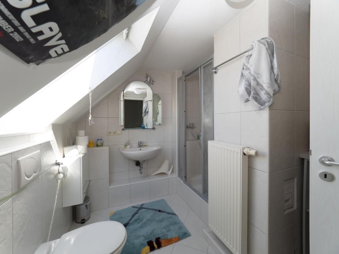 Das Dachgeschoss ist als Studio ausgebaut und wird als Arbeits- und Gästezimmer genutzt. Komfortables Bad mit Duschkabine, WC und Waschbecken.